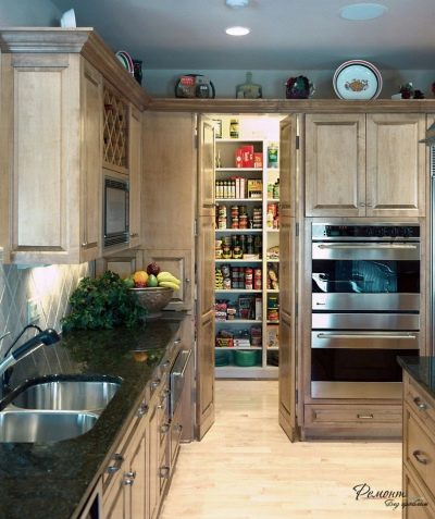 - مريح للغاية إذا كان المطبخ يذهب إلى المخزن, حيث يمكن تخزين الأطعمة المعلبة والخضروات والفواكه والتوت وما إلى ذلك.توضع الثلاجة بالقرب من هذا المكان.