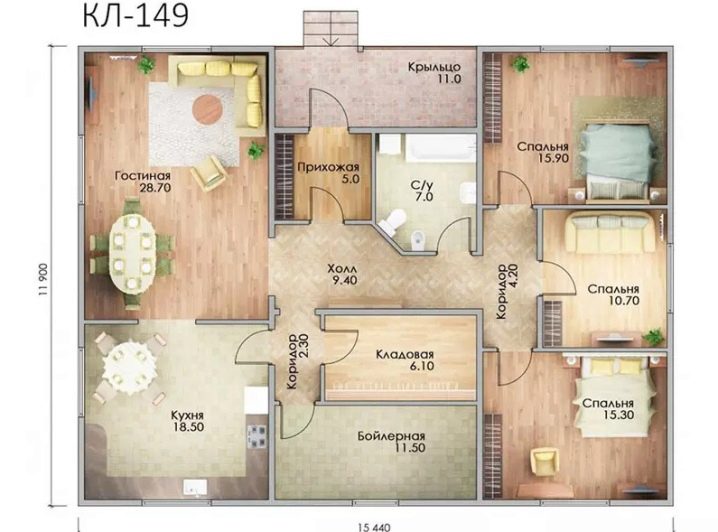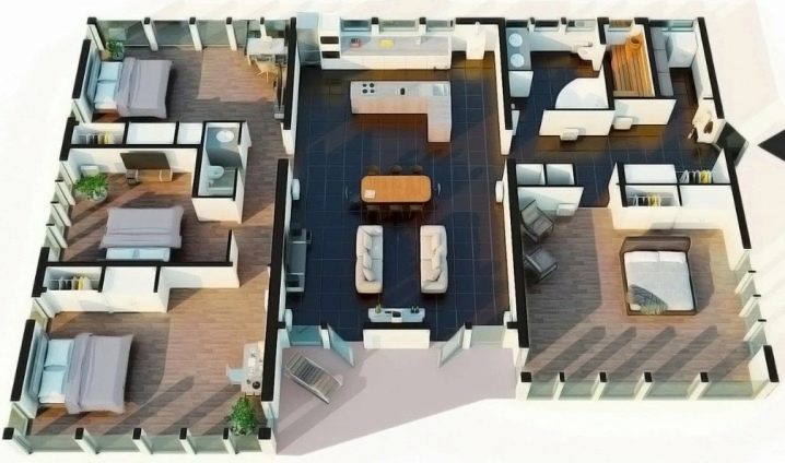 - غرف نوم على جوانب مختلفة. بالنسبة لعائلة كبيرة ، يعتبر هذا الخيار أكثر قبولًا. عادة ما يتم تخصيص غرف الأطفال بجانب واحد ، ويقع الحمام الخاص بهم في مكان قريب ، وتقع غرفة نوم الوالدين على الجانب الآخر. يمكن تقسيم المبنى عن طريق الممرات أو غرف المرافق. غرف نوم البالغين على الجانب الآخر ، قد تكون هناك غرفة معيشة قريبة.