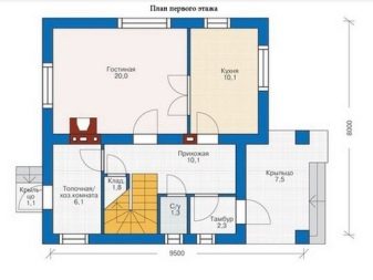 بالنظر إلى المشروع الأكثر نموذجية لمنزل من بار مع علية 9 × 8 أمتار ، يمكنك رؤية قاعة مدخل كبيرة. مساحة الطابق الأرضي – 72 مترا مربعا. م ، لذلك لا يمكن أن تكون هذه الحقيقة مفاجئة. ويؤدي هذا المدخل إلى جميع الغرف في الطابق الأرضي..