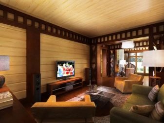 يؤدي وضع الغرف في الطابق الأرضي إلى حقيقة أن التركيز الرئيسي يجب أن يكون على غرفة المعيشة. يمكن تنظيم منطقة العمل فيه ، والتي لن تكون مقيدة بجدار ، ولكن بواسطة خزانة ، أو رف ، أو يمكن الفصل باستخدام خلفيات مختلفة. يمكنك أيضًا في غرفة المعيشة جمع الضيوف ، ويمكن استخدام المساحة الكبيرة كساحة رقص.