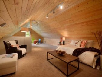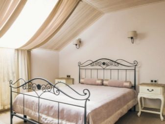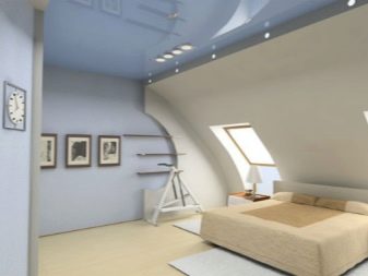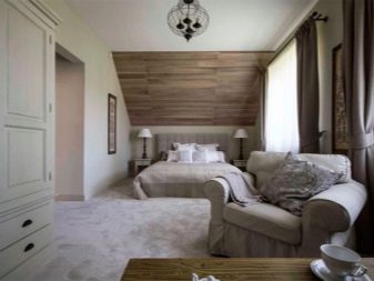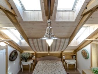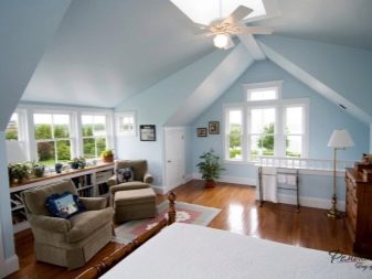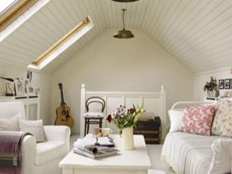 في هذه الحالة ، يجب أن يكون الجزء الداخلي من العلية مدروسًا جيدًا. يجب أن يكون نظام الألوان منسجمًا مع الهيكل بأكمله. تعتبر ألوان الباستيل الناعمة مثالية لغرفة النوم ، بالإضافة إلى أن الديكور الداخلي بألوان دافئة يمكن أن يوسع الغرفة بصريًا.