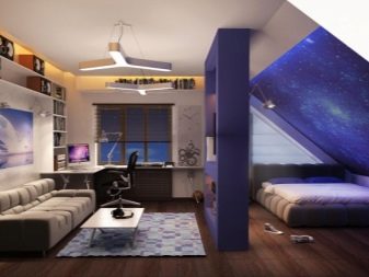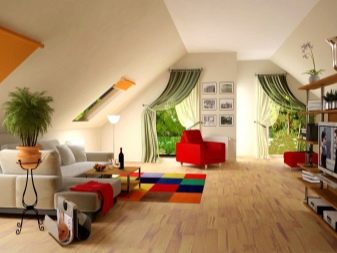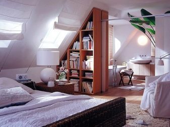 في هذه الحالة ، لا ينبغي أن يكون هناك عدد كبير من الأقسام ، وإلا ستبدو الغرفة صغيرة.. من الأفضل تقسيم العلية إلى مناطق بمساعدة الأرفف والستائر أو الشاشات الجميلة والوظيفية في نفس الوقت ، والجدران المطلية بألوان مختلفة ، والسجاد ، والستائر وغيرها من الأشياء الصغيرة اللطيفة ستساعد أيضًا.