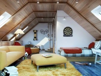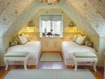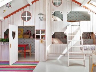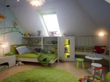 ستكون الغرفة الواقعة تحت سقف المنزل حكاية خرافية حقيقية للأطفال. ما عليك سوى وضع سرير وخزانة ملابس وخزانة ذات أدراج والتفكير في منطقة اللعب. بالنسبة لطفلين ، سيكون السرير بطابقين مناسبًا أو يمكنك وضع سريرين على طول الجدران المنحدرة. ستكون الألوان الزاهية مناسبة هنا ، والتي لا يمكنك أيضًا المبالغة فيها..