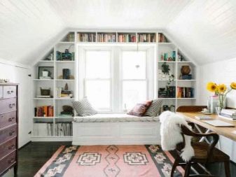 عند التخطيط لإجراء دراسة على أرضية العلية ، من الأفضل وضع الطاولة بجوار النافذة ، ووضع أرفف للوثائق والكتب على طول الجدران المنحدرة. يمكنك أيضًا وضع أريكة ناعمة وطاولة مع طقم شاي ويمكنك استقبال الزوار. لا يتطلب المكتب مساحة كبيرة ، لذا فإن هذا الخيار مناسب حتى لعلية صغيرة.