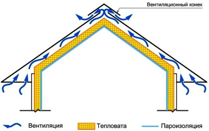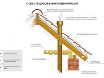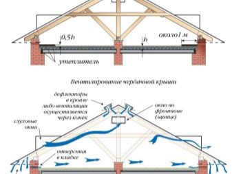 التعامل مع الرطوبة تحت سقف خشبي غير مدفأ له خصائصه الخاصة. من غير المقبول إغلاق العوارض الخشبية وكذلك الصندوق. إذا تم خياطةها ، فمن الضروري توفير فجوات تحافظ على دوران الهواء. تحت صفائح الأردواز أو الأندولين ، الموضوعة بدون عازل للبخار والرياح ، ليس من الضروري عمل تهوية إضافي: يتحرك تدفق الهواء بحرية عبر موجات التسقيف.