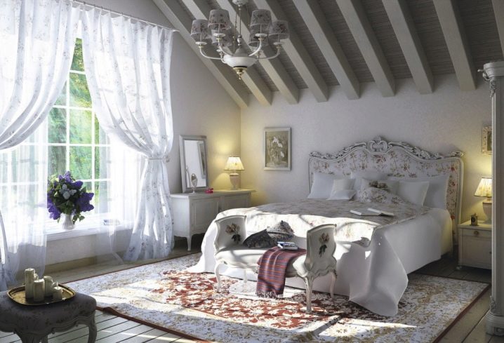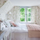غرفة نوم مريحة قريبة في حلولها لبروفانس. ستائر خفيفة وزهور ووجود أغطية خشبية – كل شيء يتحدث عن ذلك. يمكن أن تكون المجموعات متنوعة للغاية ، الشيء الرئيسي هو أن الجميع هنا مرتاحون.