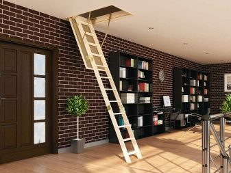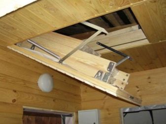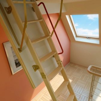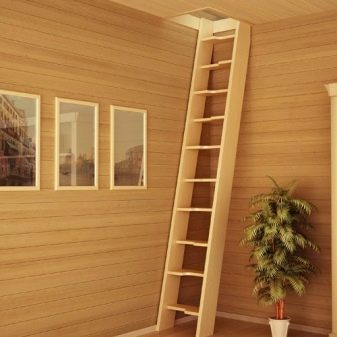 خيار آخر هو تركيب سلم محلي الصنع بجزء قابل للطي. يمكن تثبيته على باب أو فتحة سقف ، ثم يمكن طيه بسهولة للخلف وفتحه. يمكن أن يكون هناك 2-3 أقسام ، في الحالة غير المطوية يتبين أنها جامدة وثابتة. يستخدم الخشب الصلب في تركيب إطاره ودرجاته ، كما تستخدم الأجزاء المعدنية في آلية التثبيت والطي. مع التصميم الكفء والعمل الدقيق ، يمكن أن يكون هذا الهيكل آليًا ومريحًا للغاية وآمنًا تمامًا..