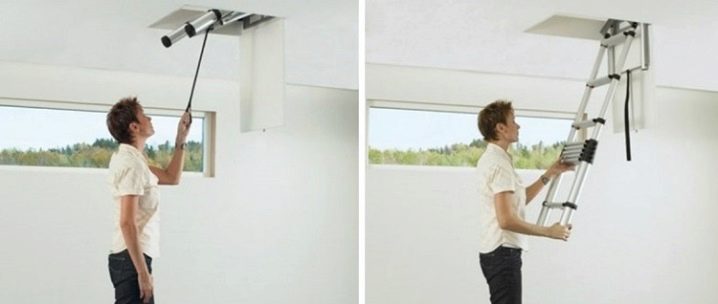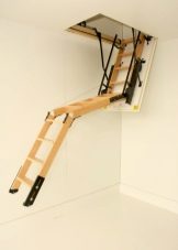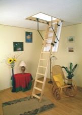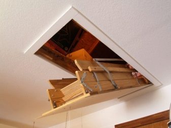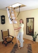 يبدو سلم خشبي قابل للطي متصل بالفتحة جميلًا. كما ترون ، الآلية مجهزة بمقبض خاص ، لذلك لا حاجة إلى سلالم أو براز..
