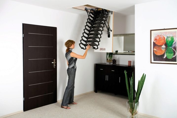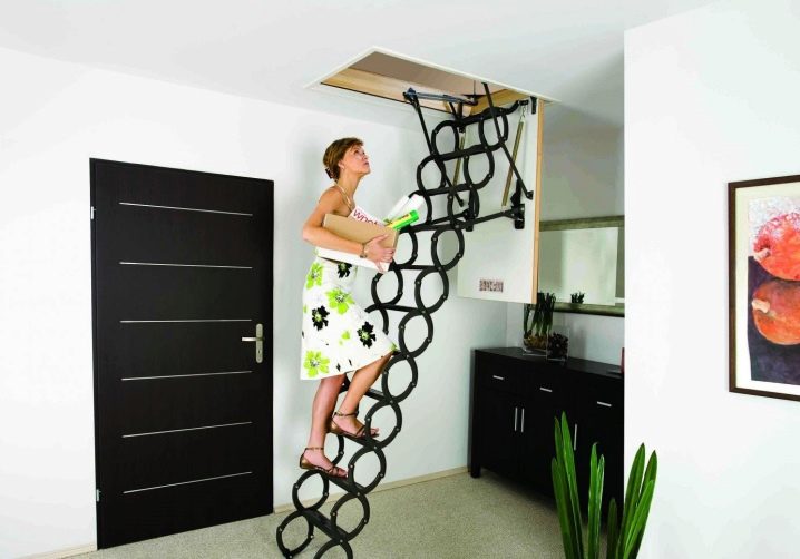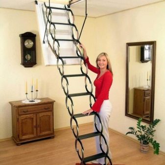 سلالم مقصية هي خيار مثير للاهتمام للهياكل المدمجة المتصلة من الداخل بفتحة العلية. غالبًا ما تكون مصنوعة بالكامل من المعدن ، وعندما يتم فتح اللوحات في العلية ، يتم وضعها مثل الأكورديون أو جامع تيار الترام. الإطار خفيف جدًا ، ويمكن تثبيته بسهولة على الفتحة الخشبية. العيب هو أنه بعد فترة من الاستخدام المكثف ، تبدأ الأجزاء المعدنية في الصرير. لذلك ، يجب ألا ننسى تشحيمها بشكل دوري..