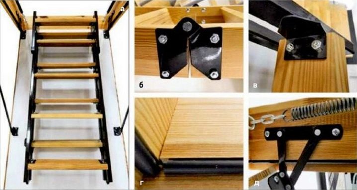- علاوة على ذلك ، يتم تثبيت المقاطع بمفصلات معدنية بطريقة يمكن من خلالها تحريك الهيكل بأكمله وطيّه بسهولة. يتم توصيل السلم المجمع المكون من ثلاثة أقسام بالفتحة باستخدام زوايا معدنية.