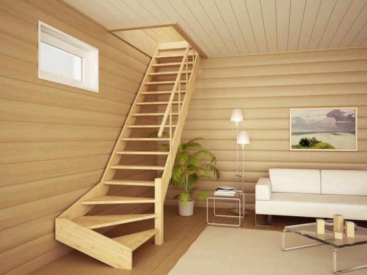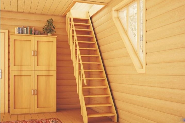 مثال آخر على درج علية في منزل خشبي يمكنك أن تصنعه بنفسك هو هيكل متآلف ثابت بامتداد واحد. يجب اختيار المكان المناسب له في زاوية الغرفة ، بحيث يقع جانب واحد من مسار الدرج على الحائط. نظرًا لأن الصعود سيكون شديد الانحدار ، فمن الأفضل تجهيز الدرج بدرابزين خشبي. للإطار والخطوات ، يتم تحديد ألواح البوصة بعرض 10 سم.