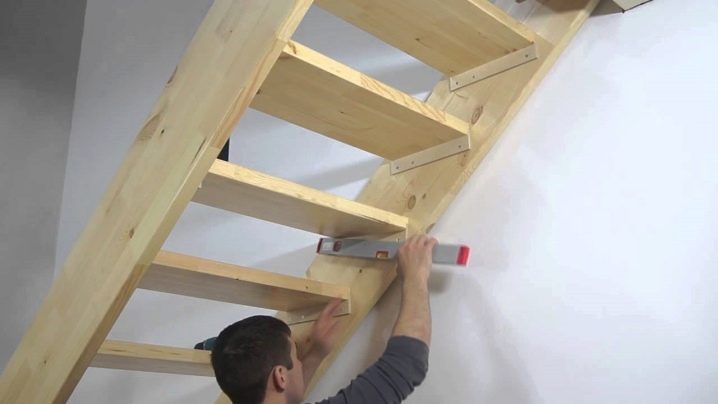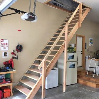 يتم قطع الخطوات بعرض 650 سم, يجب أن تكون الخطوة بينهما 10-15 سم ، وسيعتمد الطول على ارتفاع السقف. بالنسبة إلى الدرابزين ، يمكنك أن تأخذ عوارض مصقولة 5 × 5 سم ، ويتم التثبيت على المراسي أو البراغي. إذا لزم الأمر ، يتم تثبيت فتحة على فتحة العلية ، تفتح بمفصلات بمفصلات.