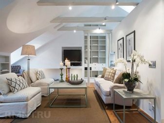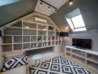عند ترتيب غرفة المعيشة ، يواجه الشخص على الفور مشاكل مرتبطة بانحدار الجدران ، لأن هذا يثير على الفور السؤال عن مكان وضع الخزائن أو الأرفف ، وهي سمة مهمة لغرفة المعيشة. أفضل مكان لوضعها هو الجانب الرأسي من العلية.. يجدر اختيار أثاث مضغوط ، ويمكنك أيضًا صنع منافذ بنفسك. من الأفضل وضع الرفوف في منتصف الغرفة ، والتي ستقسم الغرفة على الفور إلى مناطق.