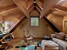 - غرفة اطفال. سيشعر الأطفال بالراحة في غرفة الأطفال المجهزة في الطابق العلوي. الغرفة كبيرة لدرجة أنه توجد مساحة كافية حتى لركوب سيارة أو دراجة نارية للأطفال. سيتمكن الطفل من اللعب بأكبر قدر ممكن تحت إشراف الوالدين. يوجد في وسط الغرفة أريكة ووسادة صغيرة يمكن للكبار الجلوس عليها أثناء مشاهدة طفلهم. إذا سئم الطفل من الركوب ، يمكنه الاسترخاء على الأريكة الكبيرة الموضوعة على الحائط المنحدر. أرضيات الباركيه متناغمة مع اللوح الخشبي على الجدران والسقف ، مما يخلق جوًا دافئًا. يمكن لجميع أفراد الأسرة الاسترخاء في هذه الغرفة..