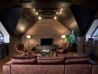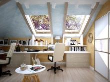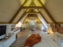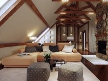 إذا كانت مساحة العلية كبيرة جدًا ، فيمكنك ترتيب غرفة معيشة مريحة لاستقبال الضيوف أو التجمعات المسائية بعد العمل مع عائلتك. بفضل النوافذ ، تحصل الغرفة على إضاءة كافية ، كما تتمتع بإطلالة ممتازة على مناطق الجذب المحلية. لهذا السبب لا ينبغي أن تكون النوافذ مغطاة بستائر, لكن من الأفضل وضع كرسي بذراعين صغير أو أريكة ناعمة بجانبهم.