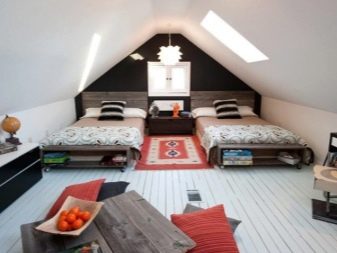 بدلاً من الأرصفة ، يمكنك استخدام الخزائن أو الأرفف. من الأفضل ترتيب الأسرة على طول الجدران, بعد كل شيء ، هذه هي المنطقة ذات السقف الأدنى. ستبدو المصابيح رائعة على الحزم ، بينما تقسم الغرفة إلى مناطق.