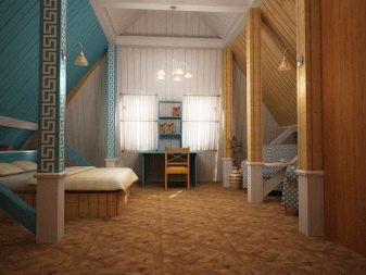 عند تزيين العلية ، لا تحتاج إلى اختيار الألوان الداكنة – فهي ستمارس إحساسًا بالضغط. بالنسبة للجدران ، من الأفضل استخدام الخشب أو تقليده.. المواد التي تحتاجها لاختيار الضوء, حتى لا تثقل كاهل هيكل ثقيل بالفعل.