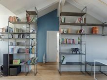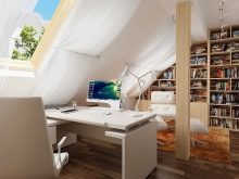 لتجهيز مكتبة في العلية ، يمكنك تثبيت الرفوف بجزء مغلق ومفتوح. في منطقة مفتوحة ، من الأفضل وضع تلك الكتب التي يتم قراءتها غالبًا وتلك التي يتم استخدامها بشكل أقل – في مكان مغلق. بعد الانتهاء من ترتيب الغرفة بهذه الطريقة ، لن يتراكم الغبار على السطح.
