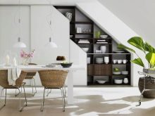 بالنسبة للخزانات أو الطاولة ، فإن المساحة الموجودة أسفل المنحدرات مناسبة. إذا كانت غرفة الطعام موجودة في هذه الغرفة ، فأنت بحاجة إلى التفكير في المكان الذي سيتم فيه تخزين الأطباق. في هذه الحالة ، يمكنك أيضًا استخدام الجملونات بتركيب رفوف زجاجية تحتها..