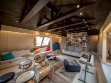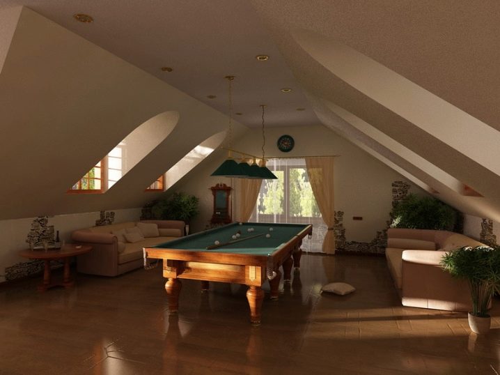 - غرفة جلوس مريحة. سيكون الخيار الأفضل هو ترتيب غرفة المعيشة. تم تزيين الجدران والسقف بألوان باستيل. يمتزج بانسجام مع الأرائك على جانبي العلية. تسمح طاولة البلياردو في منتصف الغرفة للشركة بالاستمتاع ببعض المرح والاسترخاء بعد العمل.