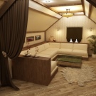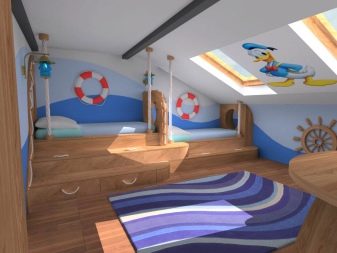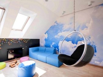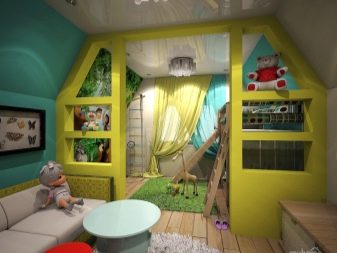 عند تجهيز حضانة في الأعلى ، يجب أن تختار على الفور بين مفهومين: غرفة ألعاب بسيطة أو مساحة كاملة لجميع احتياجات الأطفال. إذا كنت تخطط لإعداد غرفة معيشة أو ركن لقضاء وقت الفراغ ، فمن المستحسن وضع الأرائك. ومن الناحية المثالية ، إذا كان هناك مساحة خالية كافية ، يمكنك توفير أثاث جلوس إضافي وطاولة قهوة. يوجد في العلية كل الاحتمالات لتنظيم صالة ألعاب رياضية كاملة..