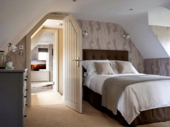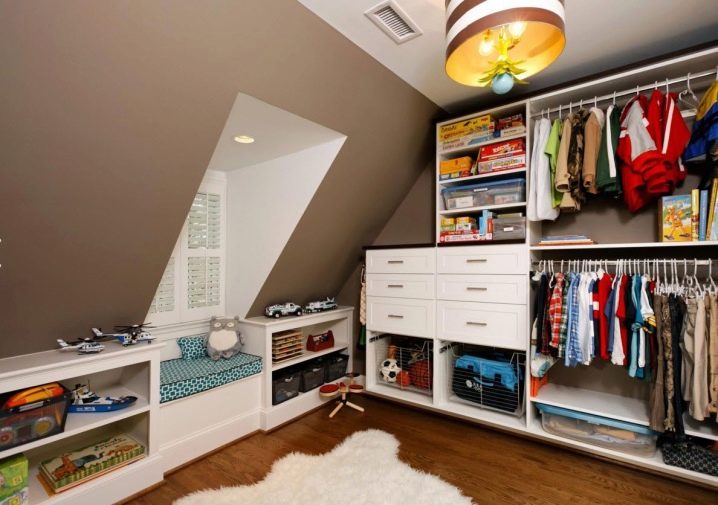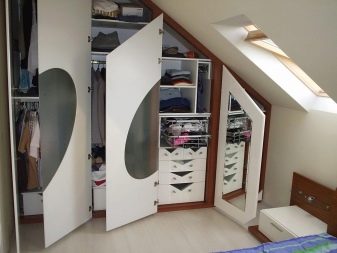 عندما يكون المنحدر منخفضًا ، يُنصح بتركيب خزائن مدمجة. تتيح لك الأرائك والأسرة المدمجة في الجدران تحقيق تأثير خارجي جذاب للغاية وجعل الغرفة أكثر عملية. بالإضافة إلى ذلك ، تزيد هذه العناصر من كفاءة استخدام المساحة الخالية..