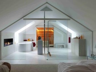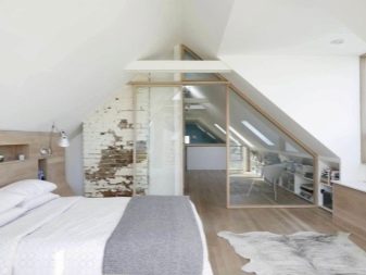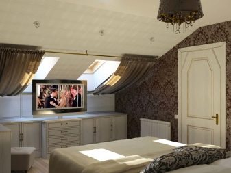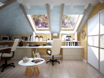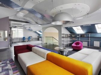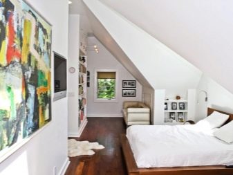 تصبح خزانة الملابس أو الرف ، بالإضافة إلى وظيفتها الرئيسية ، منظمًا ممتازًا للمساحة في العلية. يمكن فصل مناطق العمل أو الترفيه عن طريق وضع زوج من الكراسي في زوايا متقابلة. ثم يمكن للاثنين أن يباشروا أعمالهم الخاصة دون التدخل في بعضهما البعض. يتم تحقيق التصميم غير القياسي بأسلوب عالي التقنية. فقط يسمح لك بدمج الكثير من الأسطح المصنوعة من الكروم والزجاج والعناصر المضيئة والأشكال والتصاميم الهندسية البسيطة.