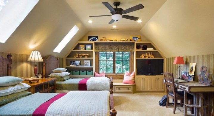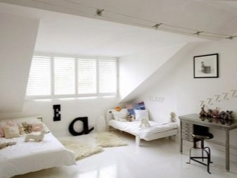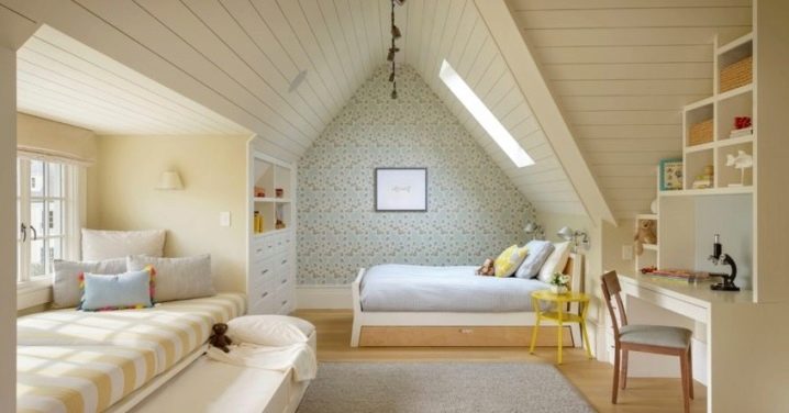 يفرض تصميم الغرفة على أرضية العلية بالفعل شروطًا معينة عند اختيار الأثاث. إذا تم إنشاء غرفة لطفلين ، فبسبب هيكل الجدران والسقف ، لن يكون من الممكن دائمًا اختيار خزائن طويلة أو أسرّة بطابقين. ومع ذلك ، يتم حل هذه المشكلة بسهولة. لذلك ، يمكن لخزانة الملابس الكبيرة أن تحل محل خزانة ذات أدراج أو خزائن حائط بسهولة..