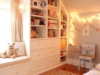 تستخدم الأرفف القابلة للسحب أو رفوف الحائط لتوفير المساحة. يمكنك الاعتناء بسرير قابل للطي يُستخدم كمكان للنوم ولتخزين الفراش أو أشياء أخرى. يمكن وضع أرفف صغيرة للكتب أو الألعاب بشكل ملائم في مكان ضيق أسفل شطبة الجدار..