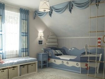 إذا سمح ارتفاع السقف ، فسيكون الحل الجيد هو وضع مجمع جمباز مثبت على الحائط في الغرفة.. تعد العديد من السلالم الخشبية حلاً رائعًا ، على سبيل المثال ، للغرفة ذات الطراز البحري. مثل هذه السلالم ستسمح للطفل أن يشعر وكأنه قبطان سفينة لا يعرف الخوف..