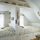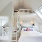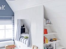 يمكن وضع السرير (لتوفير مساحة وخلق راحة إضافية) في مكان به سقف أكثر انحدارًا. سيسمح لك هذا الحل بتصميم منطقة النوم بشكل إبداعي بشكل خاص – من الممكن وضع مظلة فوق السرير وتزيين الحائط بلوحات أو أرفف بالكتب وغيرها من الأشياء الصغيرة. حتى النجوم المتوهجة في الظلام ستساهم في ظهور جو ساحر خاص..
