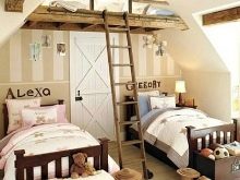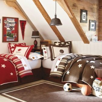 - الروح الرياضية. غرفة النوم في العلية لطفلين مزينة بألوان دافئة لطيفة ، واستخدام الخشب في الداخل يمنح الغرفة راحة خاصة. الديكور ذو طابع رياضي.