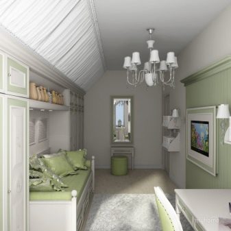 - المدينة الفاضلة الخضراء. غرفة نوم لفتاة مراهقة. مزيج رائع من اللون الأخضر الفاتح والأبيض وترتيب الأثاث المريح وتوفير المساحة والتقسيم الواضح للغرفة إلى مناطق يحول الغرفة إلى حلم حقيقي..