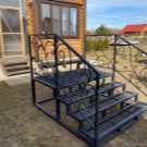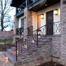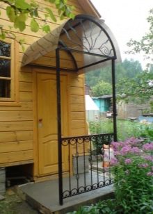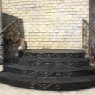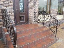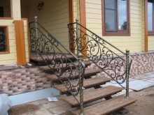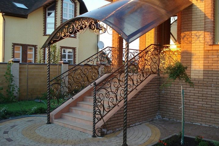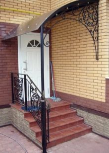 تُظهر الصورة الخطوات المصنوعة من الخرسانة. قماش الحاجب مدعوم برباط سياج مزور. نتيجة لذلك ، تبدو واجهة المنزل جميلة وغير قياسية..