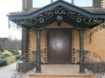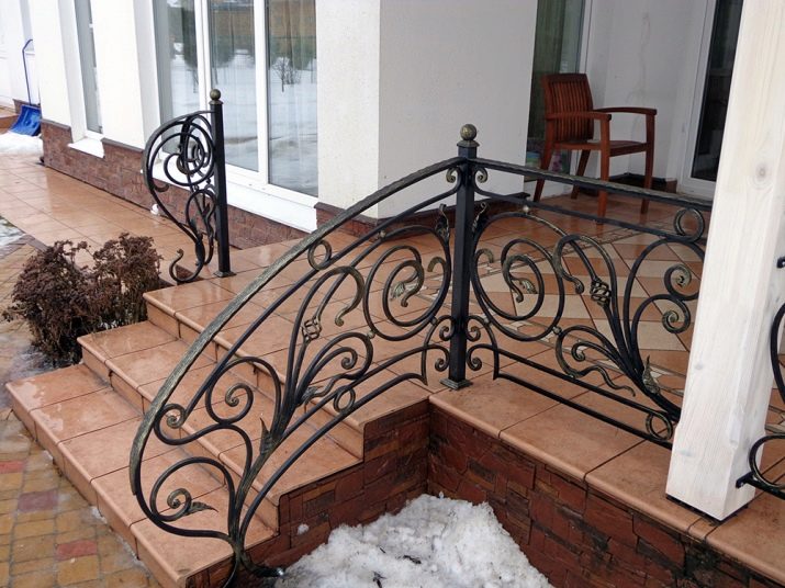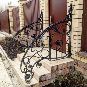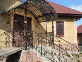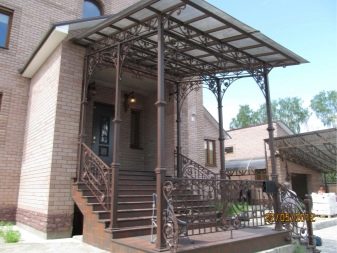 يمكن لمالك المنزل بالترتيب توفير شرفة من أي شكل ولون ، يتوافق مع النمط المختار. جنبًا إلى جنب مع الشرفة ، التي تجمع بين طرق التزوير وأنواع أخرى من مواد البناء ، يمكنك العثور على رواق يشكل مجمعًا واحدًا مزورًا.