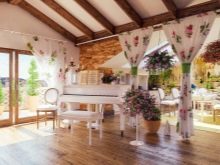 بالنسبة لأسلوب ريفي ، من المناسب استخدام الخشب كمواد تشطيب.. يمكن تطبيق الورنيش لحماية الخشب من التلف ولضمان عمر خدمة أطول. يتضمن حل التصميم هذا عددًا كبيرًا من التفاصيل المختلفة: الأباريق والمزهريات واللوحات. يمكن عمل عدة أرفف جدارية لاستيعاب جميع العناصر. بالنسبة للديكور الداخلي ، من الأفضل استخدام أثاث مريح وبسيط. يجب أن تكون بسيطة وغير شائعة. يتميز الطراز الريفي بستائر بسيطة أو تول على النوافذ..
