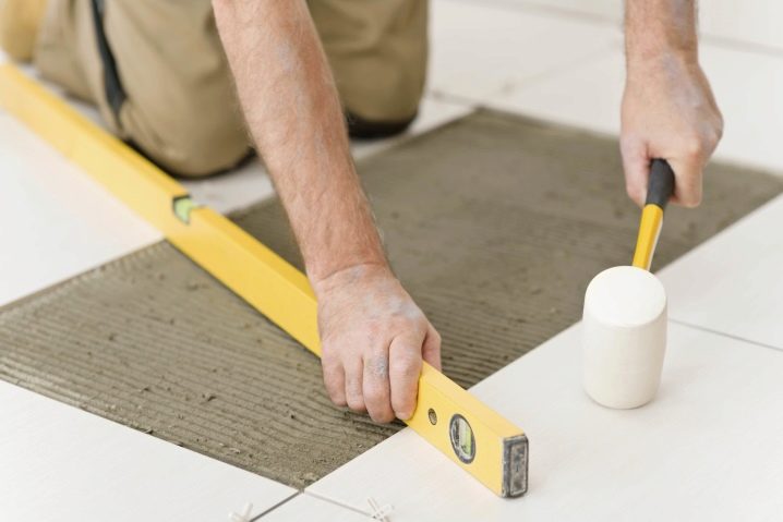 - المفتاح عند التمديد هو القضاء على الفراغات. للتحقق من ذلك ، تحتاج إلى النقر على البلاط بمطرقة مطاطية. يشير الصوت الفارغ إلى منطقة خالية من الغراء. يجب إزالة هذه اللوحة وتحويلها.