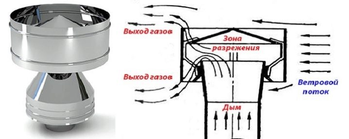 في مثل هذه الحالة ، سيكون أفضل شراء هو غطاء محرك السيارة مع عاكس.. سوف يحسن خصائص الجر للمدخنة ويزيد من كفاءة المرجل.. لن يسمح العاكس باستقرار الرطوبة على جدران الأنابيب ، مما يحميها من الغبار والسخام. سيخلق مثل هذا الجهاز منطقة من الضغط المنخفض تحت الحاجب ، حيث ستندفع منتجات الاحتراق والدخان بنشاط.