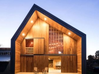 إلى جانب المنازل المصنوعة من الخرسانة الخلوية ، هناك أيضًا خيارات مصنوعة من الأخشاب. عادة ما يعني استكمالهم بعلية استخدام سقف الجملون. في الخارج ، يتم توفير تغليف بألواح خشبية أو غلاف معدني. على عكس الاسطبلات والسقائف والمستودعات ، بالطبع ، يتم توفير العزل الحراري الصحيح. بالنظر إلى هذه التفاصيل الدقيقة وغيرها ، يمكننا أن نستنتج بثقة أنه من الأصح بناء حظائر من طابق واحد وفقًا لمشاريع الشركة ، وليس وفقًا لخطط مدروسة بشكل مستقل..