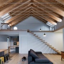 في الوقت نفسه ، يجب ألا ننسى ترتيب العلية.. إنه مصمم بطريقة تجعله مريحًا للراحة هناك. حيثما أمكن ، يتم استخدام الإضاءة الاصطناعية في الحظائر. يجب أن يركز التصميم على التوازن الأمثل بين الدوافع عالية التقنية والبساطة البصرية. يجدر النظر في تحسين الموقع.