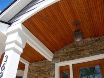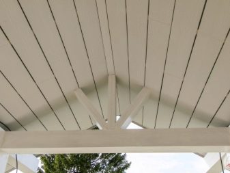 فوق الشرفة ، يتم تثبيت المظلات ، وفي كثير من الحالات يحتاجون إلى زخرفة السقف من داخل الهيكل. لإنهاء السقف ، استخدم الخشب وبطانة PVC والمعادن. الخشب الرقائقي ليس الخيار الأفضل ، ولكن يتم اختياره أيضًا كسقف في المناطق ذات المناخ الجاف.. بالإضافة إلى المواد المدرجة ، يمكنك استخدام منتجات أخرى..