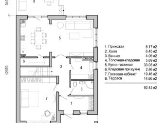 يتضمن تصميم هذه المباني تقسيمًا إلى منطقة وظيفية ليلا ونهارا.. كقاعدة عامة ، الطابق الأول مخصص لغرف المرافق. توجد هنا أيضًا غرف مشتركة – غرفة معيشة ومكتبة بالإضافة إلى مطبخ وغرفة طعام. عادة ، يوجد مخرج إلى الشرفة من غرفة الضيف أو غرفة الطعام..