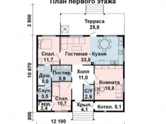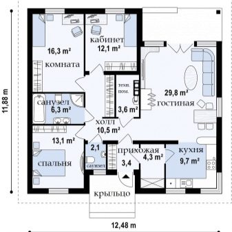 يمكن حتى أن تكون المنازل نصف الخشبية المكونة من طابق واحد مصنوعة من الخرسانة الخلوية ، ولكن على أي حال ، من المهم توزيع المباني بعناية والتفكير في ترتيبها. في أحد المتغيرات توجد غرفة تقنية في المركز ذاته. غرفة ضيوف تبلغ مساحتها 29.8 مترًا مربعًا. م ومن السمات الجيدة للمشروع أيضًا خزانة تبلغ مساحتها 12 مترًا مربعًا. كما تم تجهيز المنزل بما يلي: