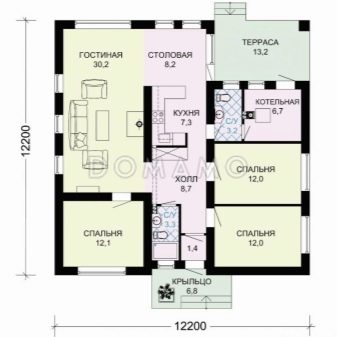 يتضمن الحل الآخر مع النوافذ البانورامية تخصيص غرفة معيشة لـ 30 مربعًا. لتناول طعام الغداء ، يمكن للمقيمين التجمع في غرفة الطعام التي تبلغ مساحتها 8.2 متر مربع. يتم وضع معدات الغلايات في غرفة منفصلة. هناك 3 غرف نوم تبلغ مساحتها حوالي 12 مترًا مربعًا. م كل وقاعة. وكذلك فكر المطورون في ترتيب المطبخ والشرفة.