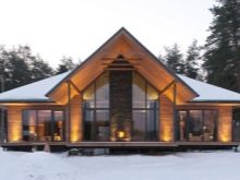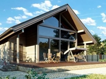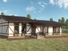يبدو المنزل نصف الخشبي المكون من طابق واحد مع نوافذ بانورامية وسقف الجملون جذابًا للغاية. تبين أن هيكل الواجهة مع التقسيم إلى أقسام يعد حلاً جيدًا تمامًا..