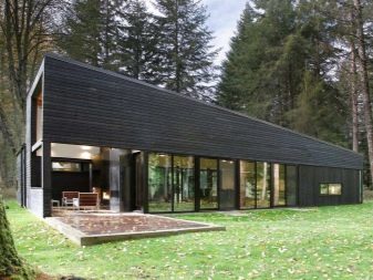 يمكنك أيضًا اختيار حل آخر – مسكن بواجهة مظلمة وسقف مائل. السمة الجذابة لمثل هذه الخطة هي التراس المجهز جيدًا..