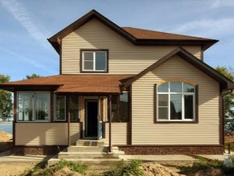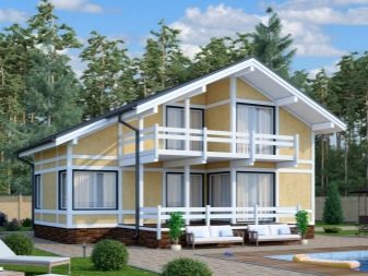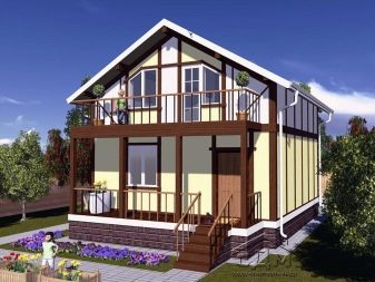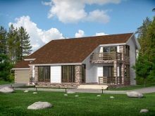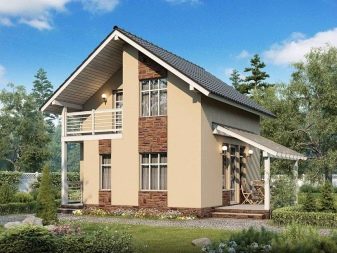 إن الجمع بين الشرفة الصغيرة والكسوة الحجرية والجصية يمنح المنزل المكون من طابقين جودة متينة وأساسية. في الوقت نفسه ، التصميم المعماري صغير نوعًا ما واقتصادي: السقف ذو المنحدرين سهل التركيب ، وتكاليف التدفئة غائبة عمليًا بسبب الشرفة المفتوحة والتراس في الطابق الثاني.