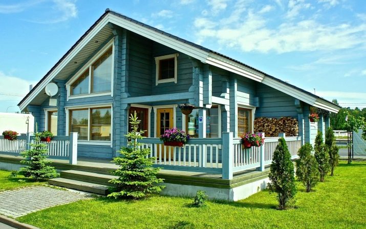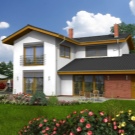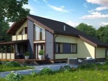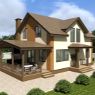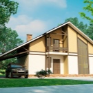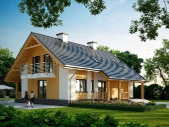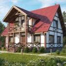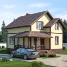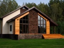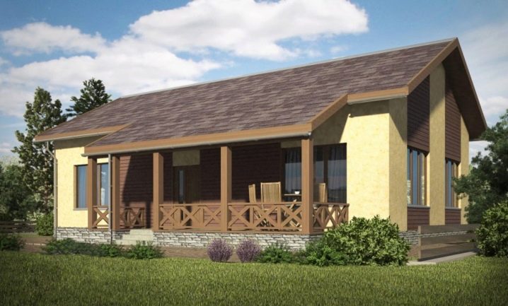 منزل تقليدي من طابق واحد مع شرفة واسعة وسقف من طابقين ، خيار مثالي لعائلة صغيرة. تخلق الألواح الخشبية والجص ، بالإضافة إلى الأشكال الواضحة ، المظهر النهائي للمبنى. سيجعل عدم وجود شرفة أرضية زجاجية ونوافذ كبيرة من الممكن التوفير في تدفئة المبنى.