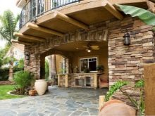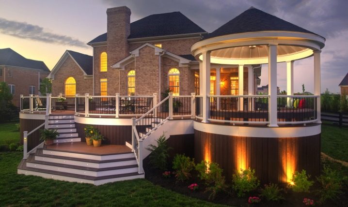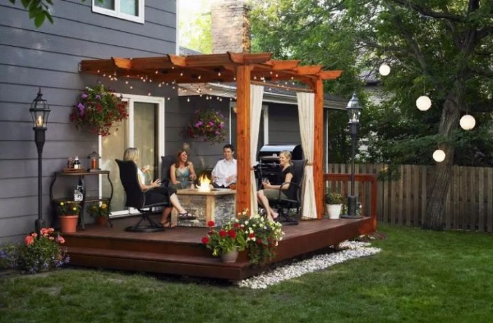 المنطقة المجاورة مكملة بمقاعد وأعمدة إنارة. يزين بعض الملاك الشرفة بالتماثيل والأعمدة والأقواس الجميلة والمزهريات الحجرية. على موقع كبير ، منطقة الترفيه محاطة بالستائر ، مما يخلق راحة خاصة. انظر إلى الصورة كيف يمكنك الجلوس بشكل مريح على الشرفة مع الأصدقاء حول نار حية في جو من الزهور الجميلة والفوانيس الرومانسية.