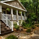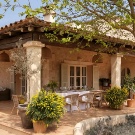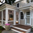 - شرفة جميلة طابع قروي مع مدخل جانبي إلى الشرفة. يقع باب المنزل على جانب الشرفة.
